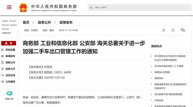 11 月 14 日消息亿操盘,商务部等四部门发布通知加强二手车出口管理,严控新车以二手车名义出口,自 2026 年起对相关车辆严审售后材料,同时规范许可证申领发放,建立企业动态管理机制。新政还要求提升企业国际经营能力,完善配套体系。乘联分会秘书长崔东树认为,新政将推动行业转向"拼品质、拼服务",优化海外市场结构,助力中国汽车出口。