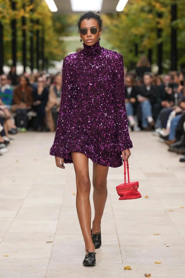 看似格格不入的紫色亮片鸡尾酒裙十分吸睛,70 年代的复古魅力在此刻悉数呈现。