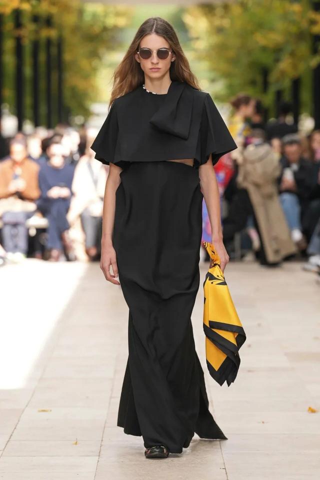 廓形简约、剪裁利落的长裙带着流畅的呼吸感,没有一丝拖沓,时尚属性与舒适度兼容。看似随意打了个结的丝巾斗篷也贵气十足。