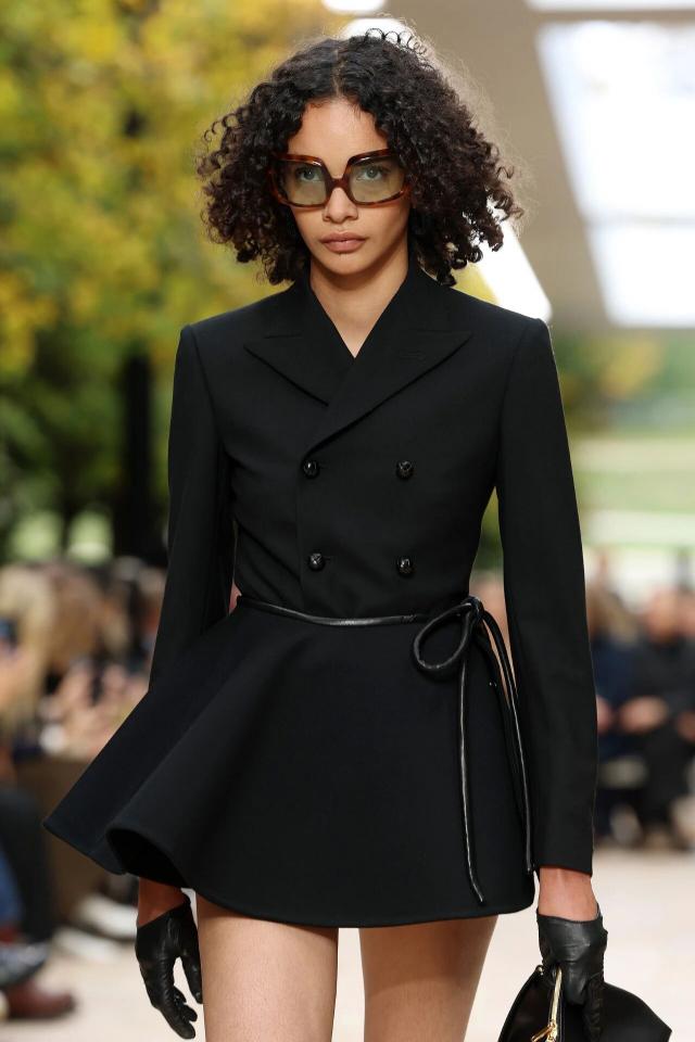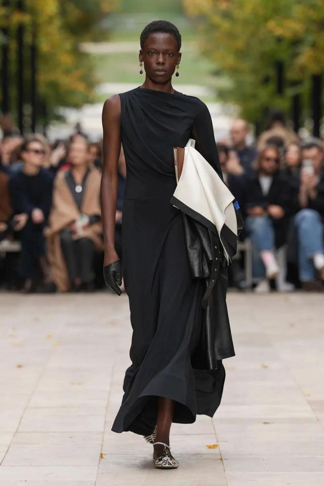 不对称褶裥以微妙的扭曲姿态强化了潇洒个性,传递出一种不刻意的自如收放感,All Black 当然也可以很生动。