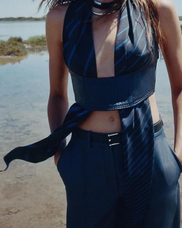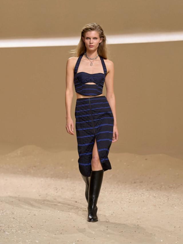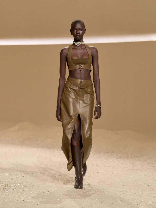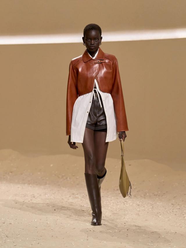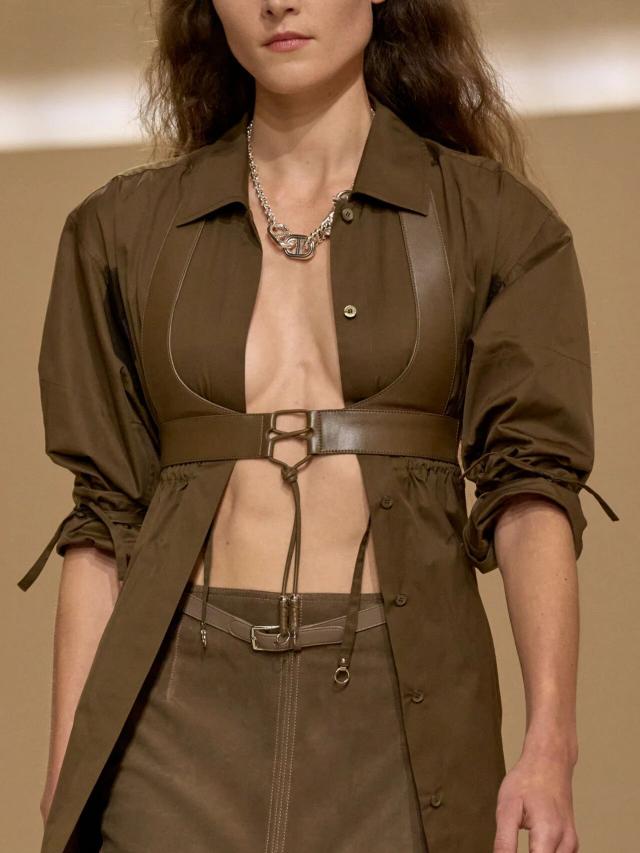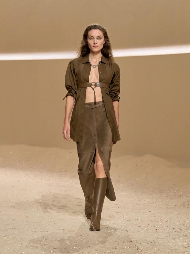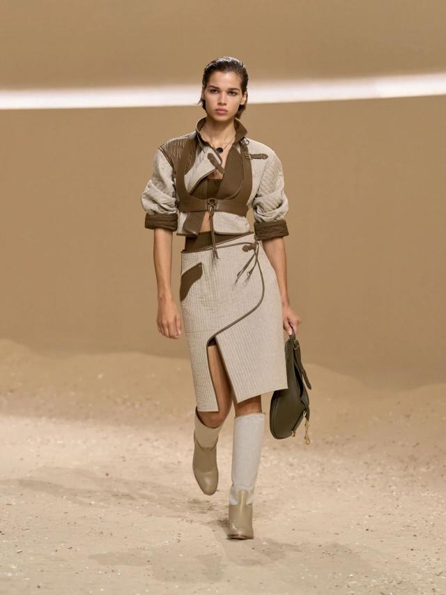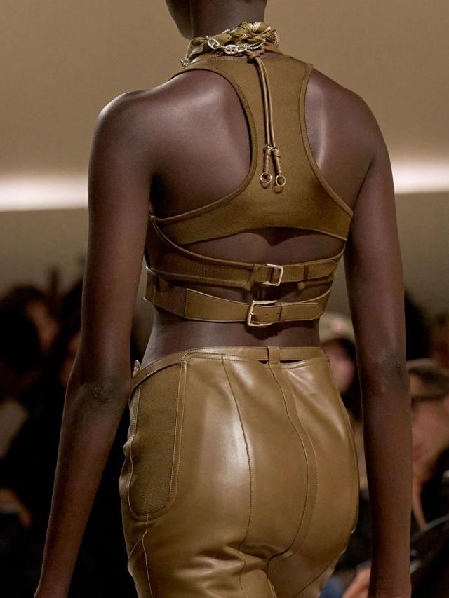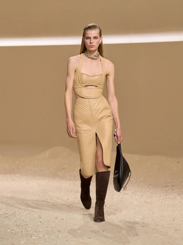 本季设计灵感,同样也与卡马格地区密不可分。Vanh é e 提到,Herm è s 档案馆中珍藏的一副来自卡马格地区的古老马鞍吸引了她的注意,"我想赋予它一种自由、随性和波西米亚风情的精神,并将马术风格融入到这座城市中。"于是,她将其转译重制,最典型的则是系列中出现在大多数造型上的皮革紧身胸衣。