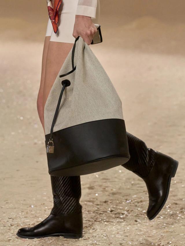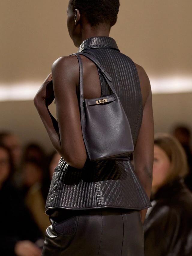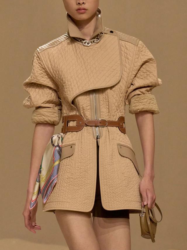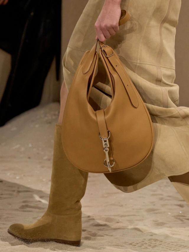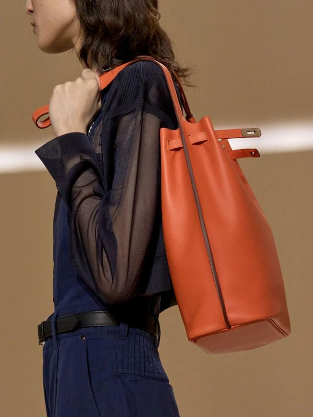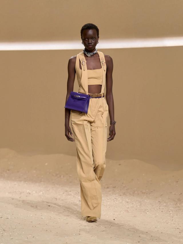 众所周知,Herm è s 的灵魂仍然以匠心工艺手工打造的皮革包袋为主,而著名的 Birkin、Kelly 等经典包袋也在本季迎来焕新。前者以优雅的棕褐色或黑色绒面皮革与经典的棕白色皮革拼接亮相,而后者则以亮眼的紫色出现在一位身着素净卡其色套装的模特腰间。