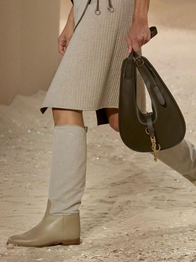 该款及膝筒靴有着不对称的鞋领设计,线条流畅,鞋头较为圆润,为了与造型适配,部分采用拼色、压纹和极密绗缝工艺处理,少量采用绒面麂皮材质,可自由搭配日常与骑装。毫无疑问,这也是她为每一位 Herm è s 女郎打造的着装衣橱配件之一。