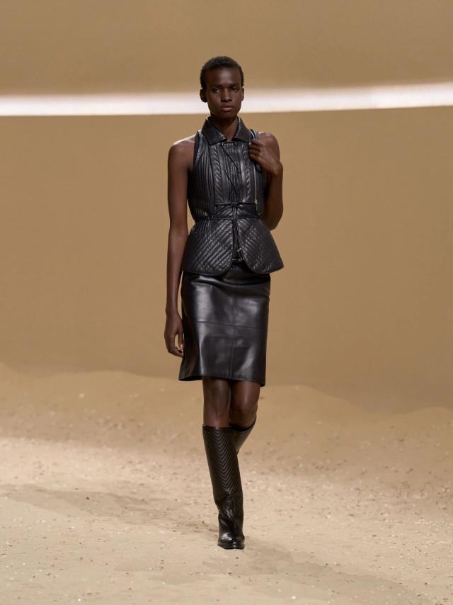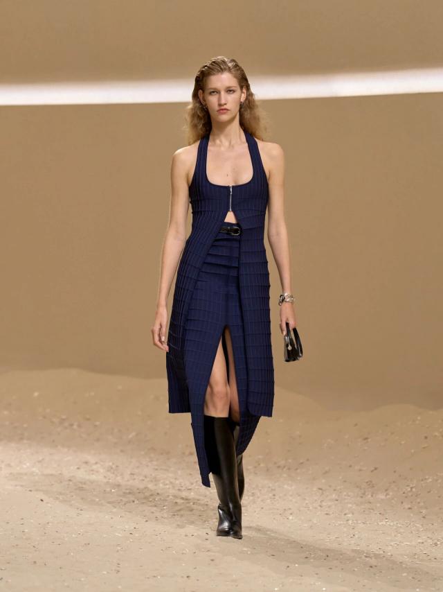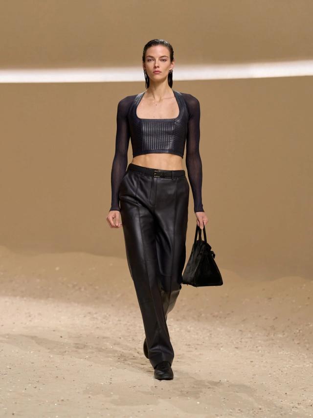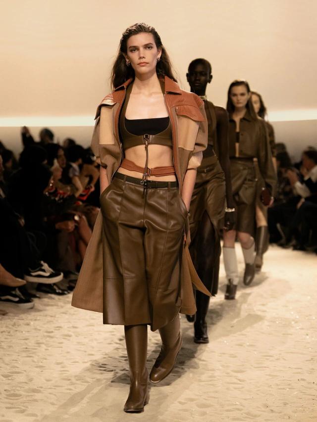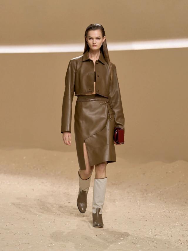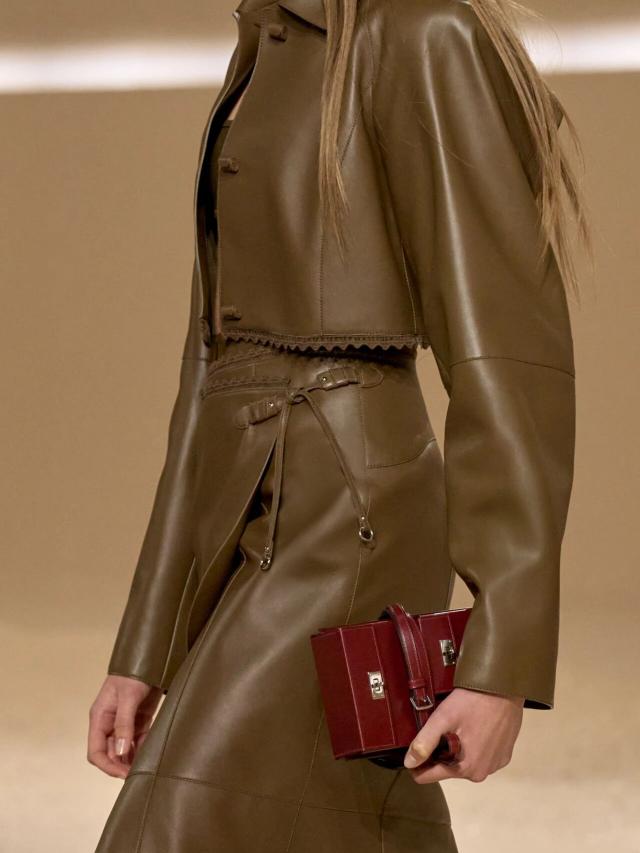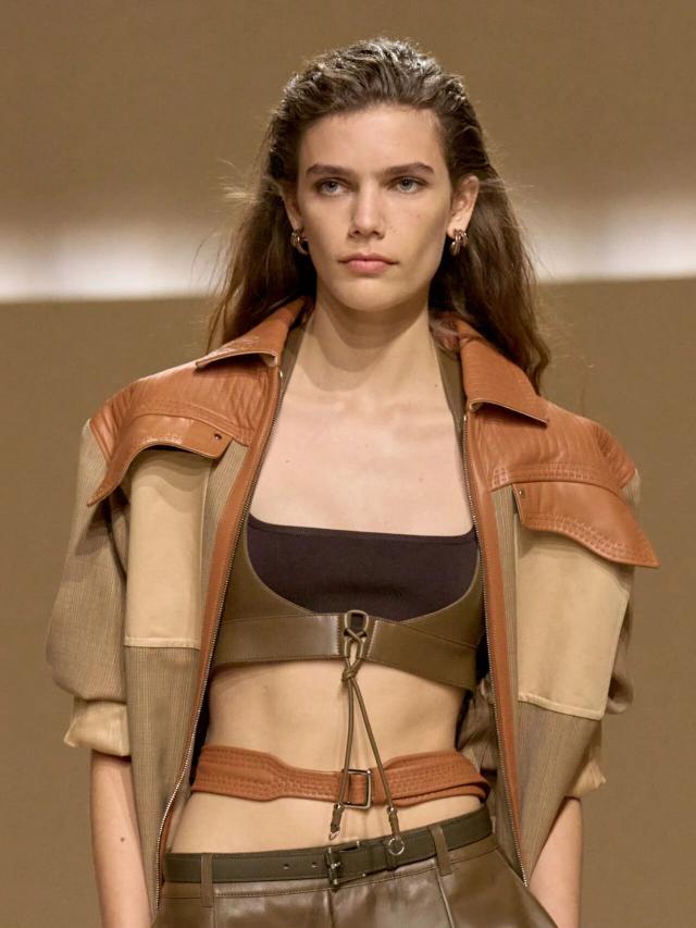 不仅如此,皮革胸衣也为整体造型增添了一份力量感威贤配资,精准的剪裁像是围绕女性身体曲线绘制而成,与那些皮质拼接短裙、半身裙和长裤一同为当代女性构筑了一层软盔甲,彰显了 Herm è s 精湛的皮革工艺,又致意女性的勇敢无畏和不羁气质。