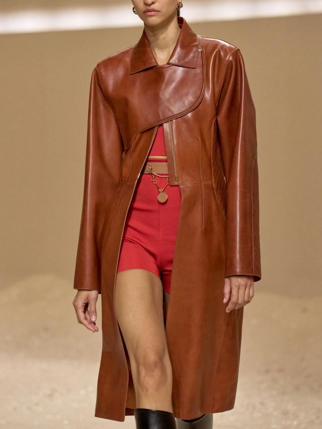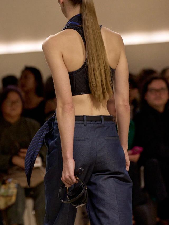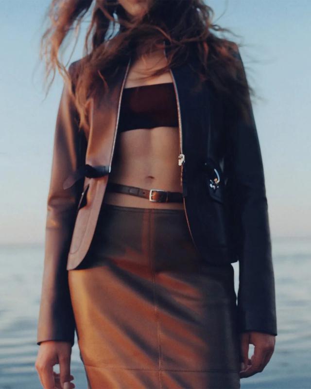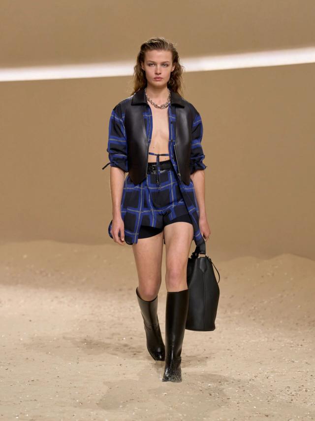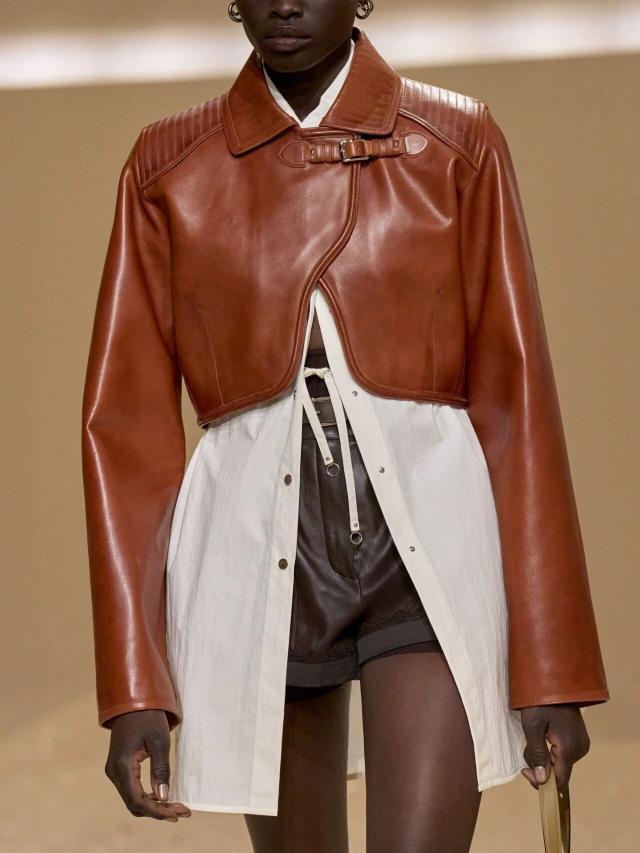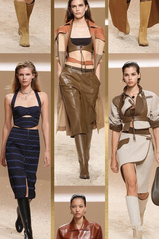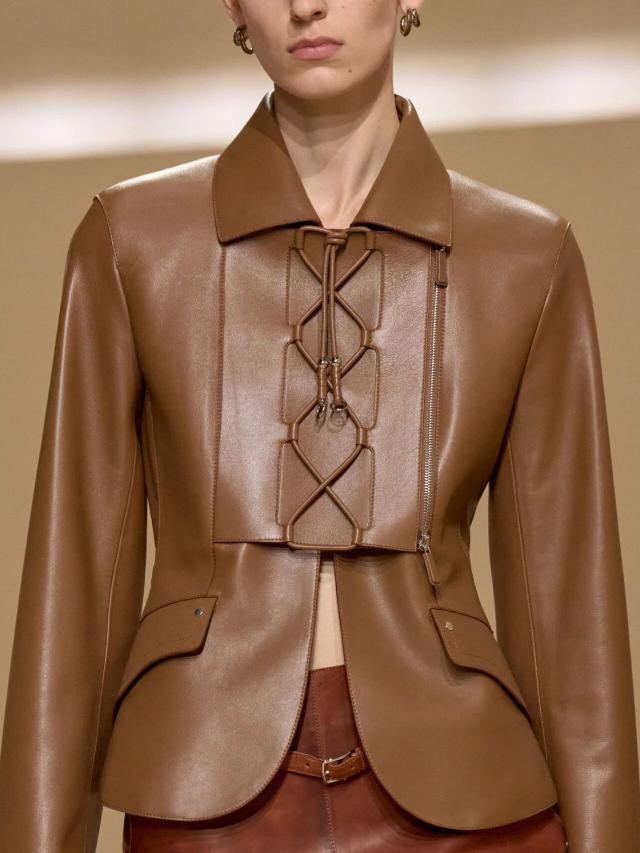 不仅如此,皮革胸衣也为整体造型增添了一份力量感威贤配资,精准的剪裁像是围绕女性身体曲线绘制而成,与那些皮质拼接短裙、半身裙和长裤一同为当代女性构筑了一层软盔甲,彰显了 Herm è s 精湛的皮革工艺,又致意女性的勇敢无畏和不羁气质。