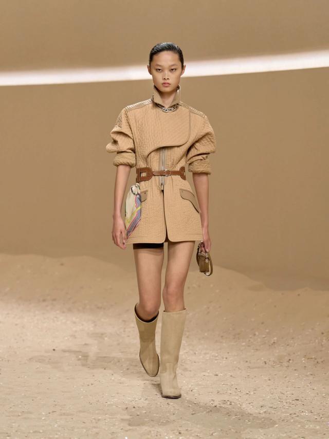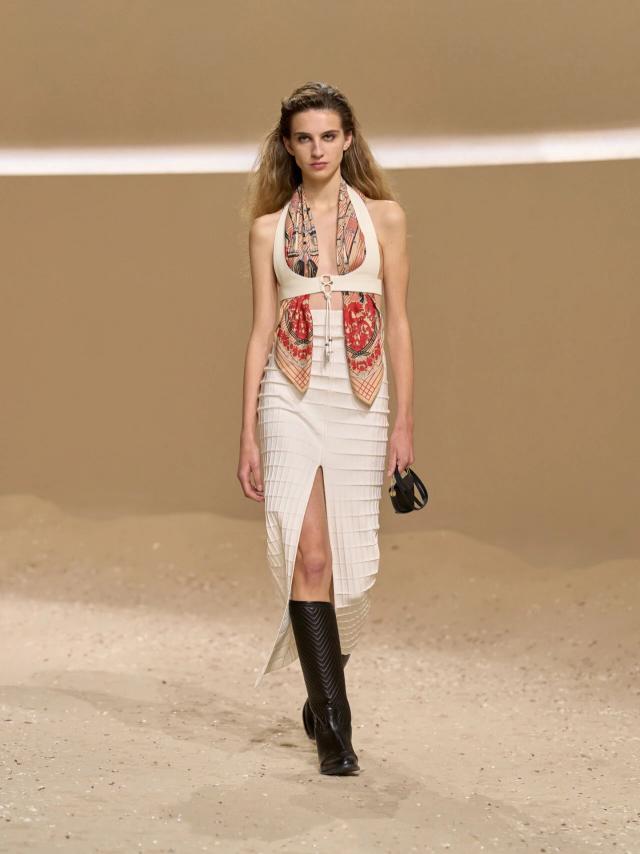 虽然 Herm è s 以马术传统和皮革工艺著称,但自 Vanh é e 2014 年接任女装艺术总监以来的 11 年时间里,她对品牌标志性的真丝方巾同样着迷。稍稍翻阅往季系列,她经常会将丝巾艺术融入女装设计,或提炼灵动图案,或径直垂于腰间,为 Herm è s 一贯精准无比的调色盘中注入更具活力的动感。
