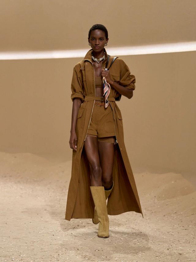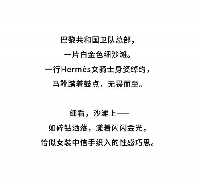 为呼应这种氛围,巴黎共和国卫队总部秀场空间的地面铺上了一层细沙,下意识令人联想到马术竞技场景。这不仅点明了品牌悠久的马术传统,更为模特行走时提供出色的摩擦力,以便呈现更加沉稳从容的步姿。