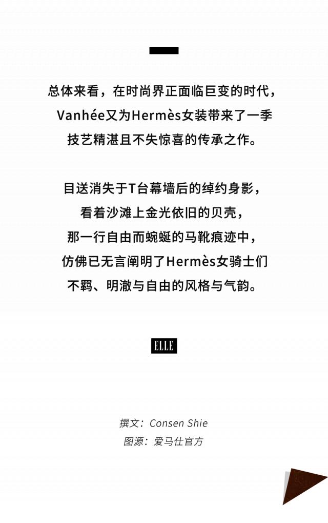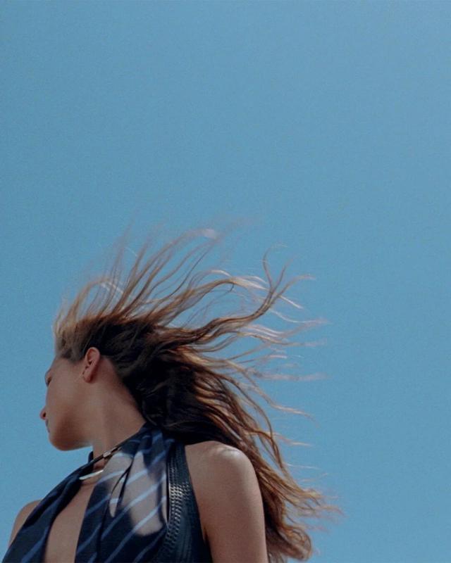 短片中,日晒夏日,海水咸湿,她的褐色长发与棕色长款风衣随风飘扬,脚踩一双黑色长筒马靴,沿海滩漫步。自在随性,松弛而又不失性感的迷人魅力。这也几乎奠定了女装艺术总监 Nad è ge Vanh é e 在本季系列中为 Herm è s 塑造的自由女骑士形象。