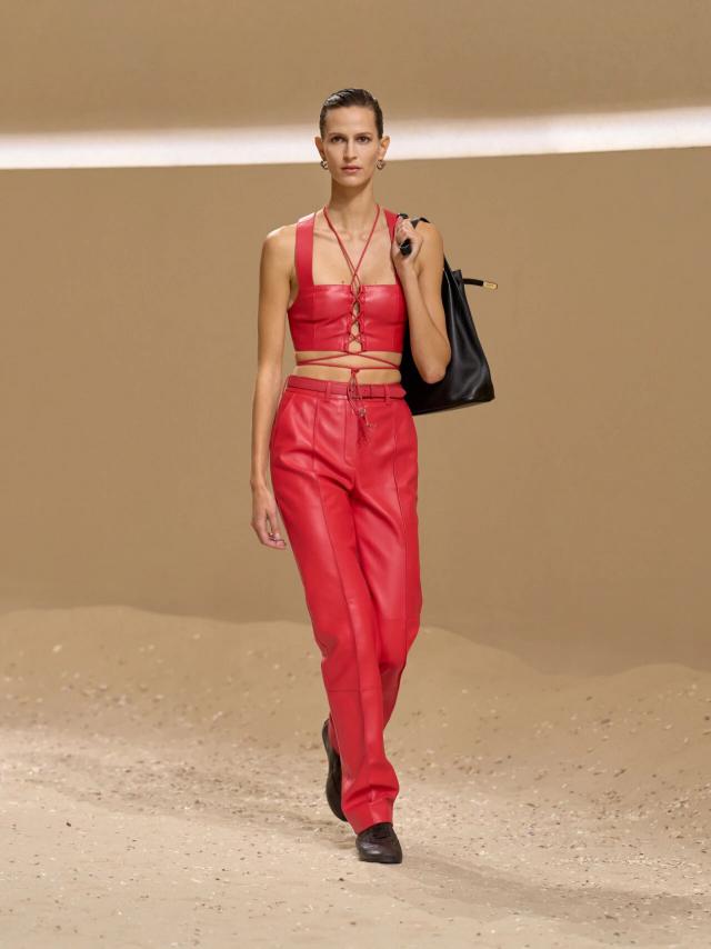 作为 Herm è s 基因的马术运动传统,Vanh é e 在一众皮革造型中还加入了一些贴身剪裁的骑行裤以示强化。一些采用连体衣款式,一些则是胸衣与短裤的分割式设计,与皮革、工装短裤的差异性材质丰富视觉上的造型层次感,又出现了几套明丽红活跃了春夏季的整体氛围。